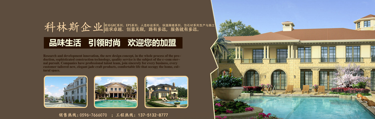 漳州市科林斯裝飾材料有限公司主營產品:歐標GRC、EPS、彩色砂巖、仿石漆、石材、 保溫隔墻系列等。科林斯企業始建于2002年,現旗下有:東莞市科林斯裝飾材料有限公司、漳州市科林斯裝飾材料有限公司、晉江市科林斯建筑材料有限公司等七家全資子公司。企業擁有中高級管理人才500人,生產技術人員1000人,專業安裝技術工人3000余人。GRC系列產品年產量達80萬平方米,人造砂巖系列產品產量達30萬平方米,EPS及EPS砂巖系列產品產量達50萬平方米。